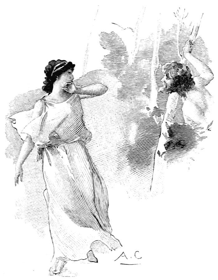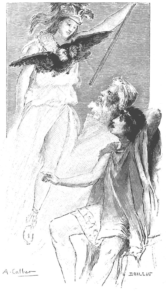 Au milieu d'eux, Télémaque, songeur, aperçoit la déesse, et venant la prendre par la main, il lui dit: