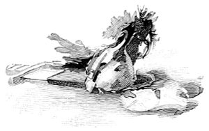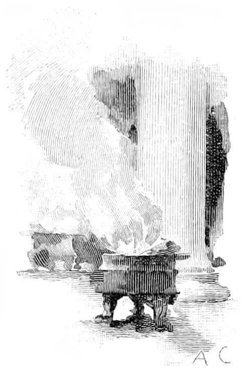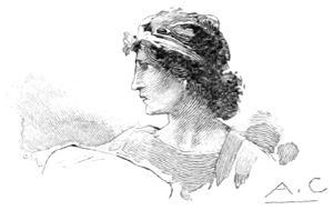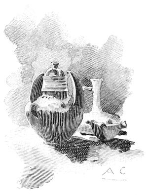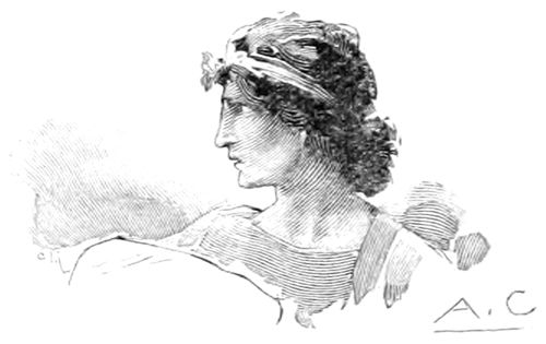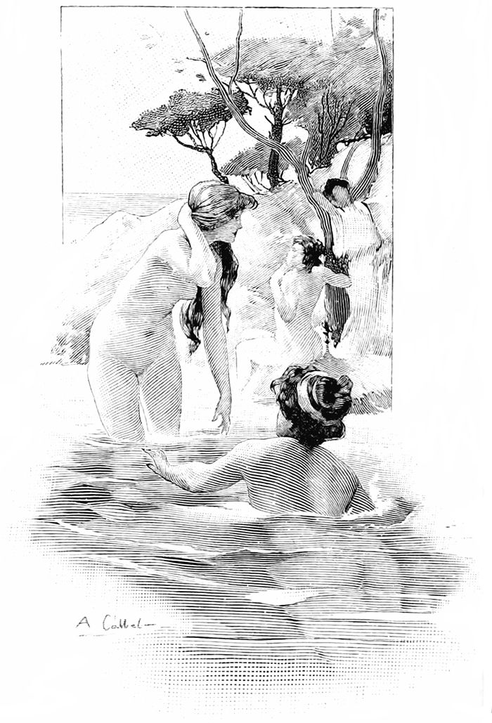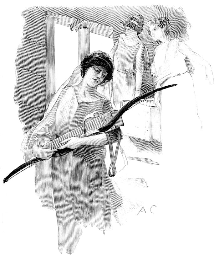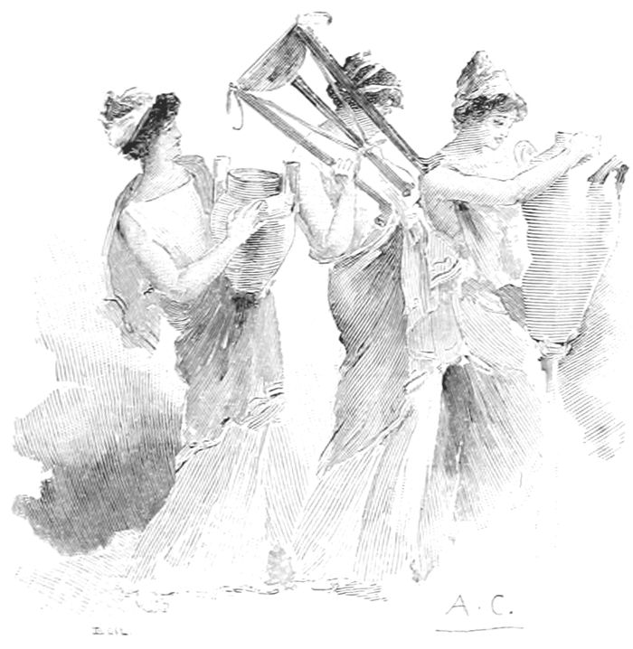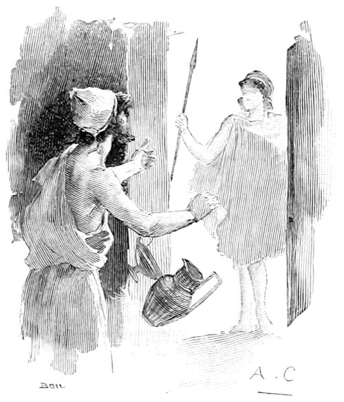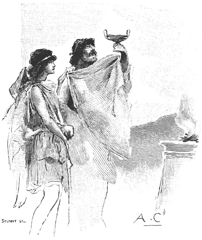 Alors entrèrent les prétendants superbes; les hérauts leur versèrent 7 l'eau sur les mains; des servantes servirent le pain et des serviteurs remplirent les cratères.—La faim et la soif apaisées, un héraut mit une lyre aux mains de Phémios et tandis qu'il préludait, par contrainte, devant les prétendants, Télémaque dit bas à Minerve: