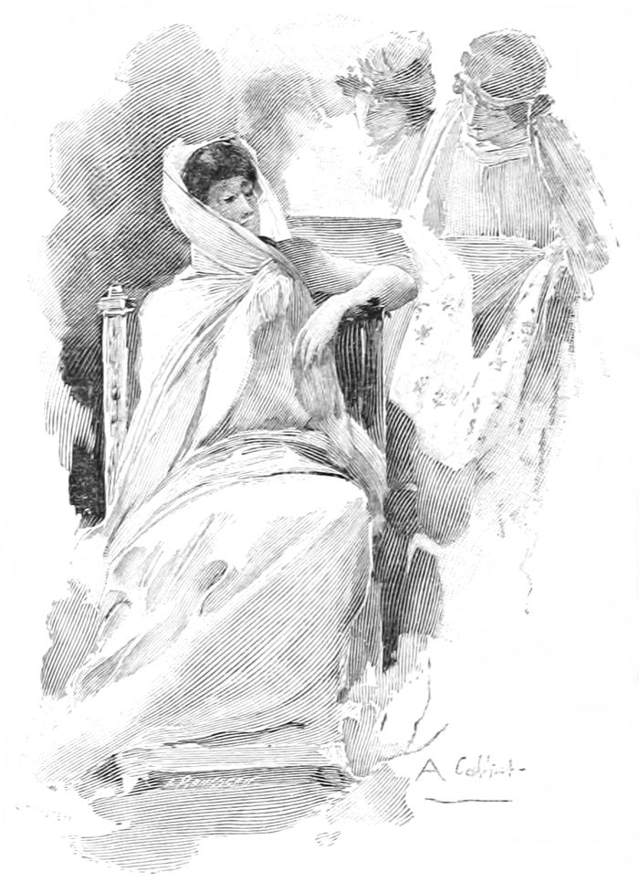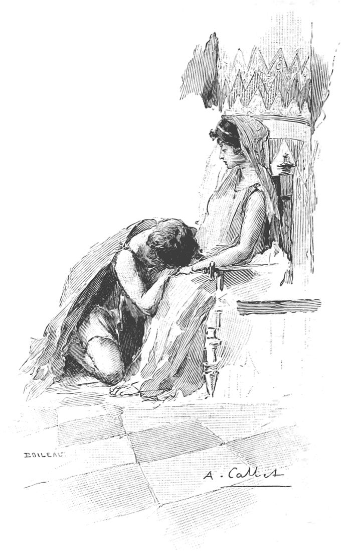 Télémaque, semblable à un dieu, rejoignit les prétendants; en ce moment l'aède illustre chantait le retour funeste des Achéens au sortir de Troie; tous l'écoutaient en silence. La prudente Pénélope entendait ce chant divin et son cœur se fondait de douleur; elle descendit le bel escalier de marbre, et du seuil de la salle, deux suivantes à ses côtés, la fille d'Icarios, tout en larmes sous son voile brillant, dit à l'aède divin: