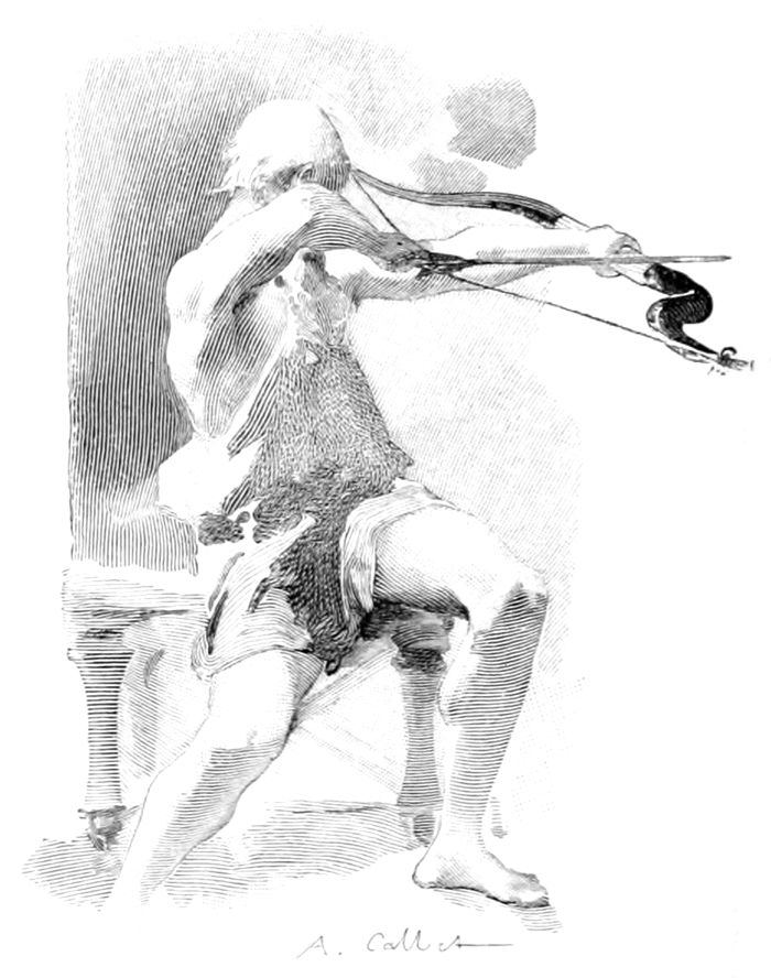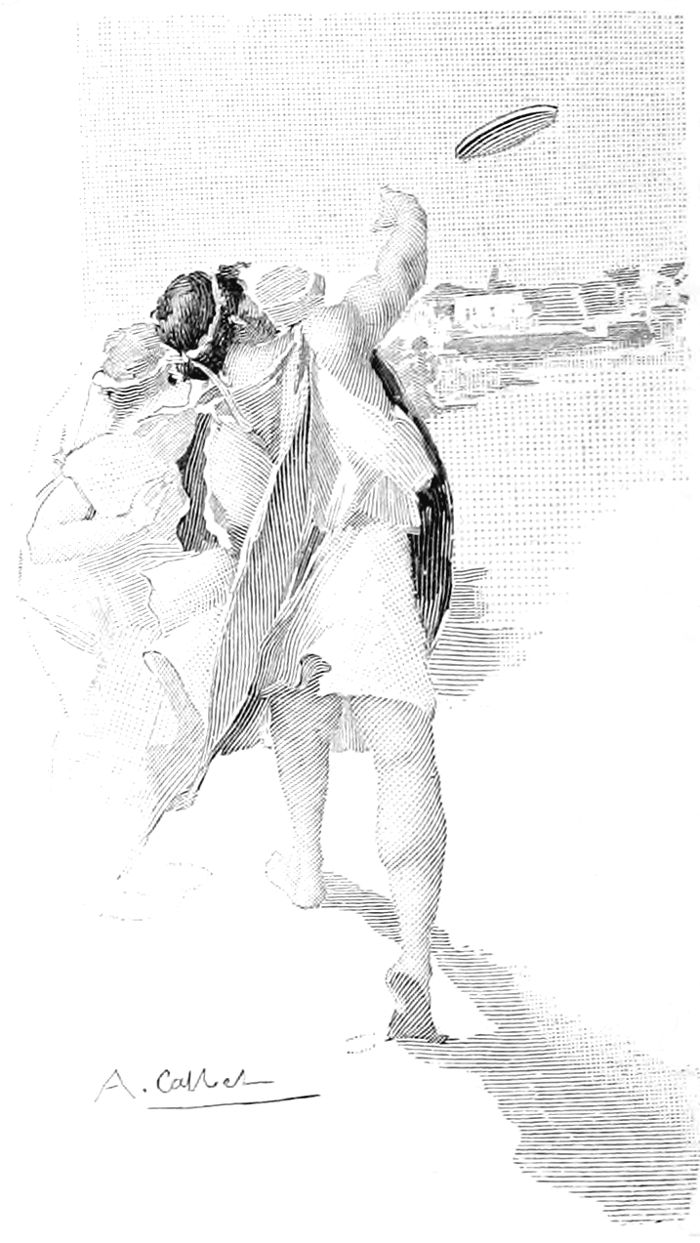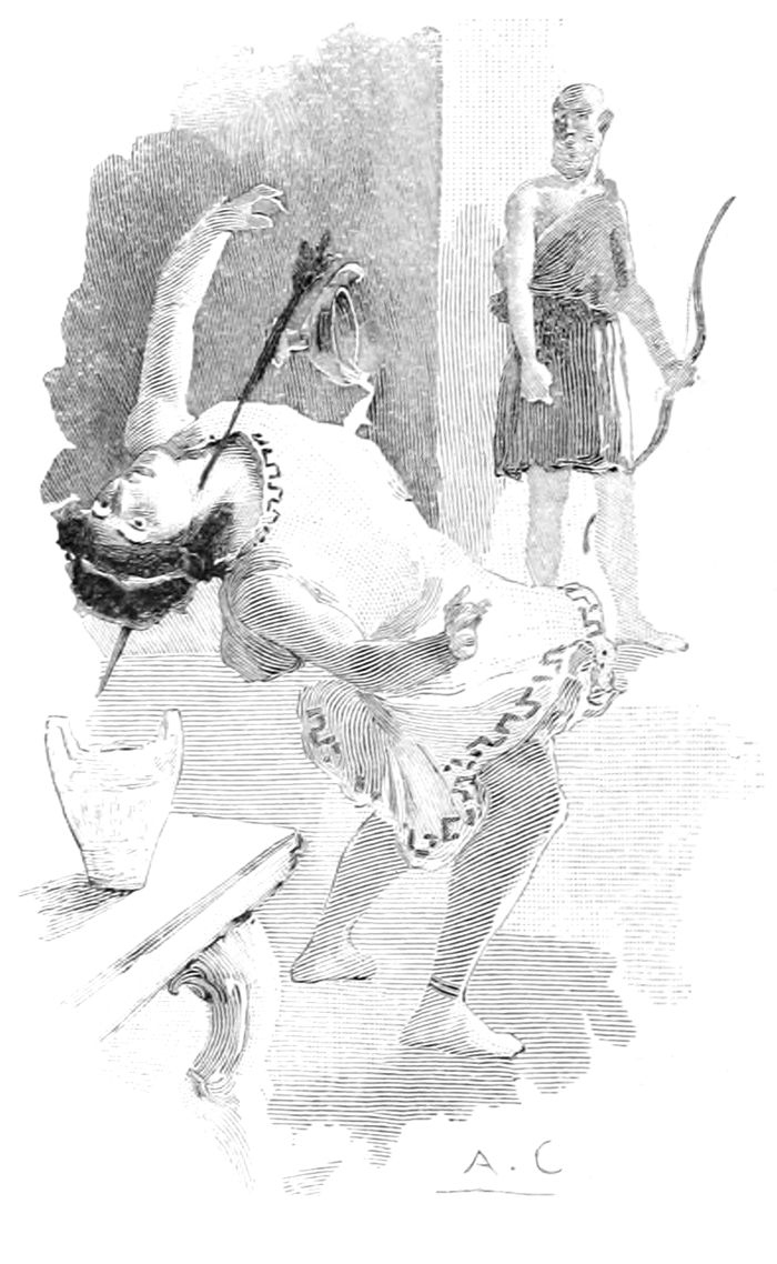 Elle dit et attachant ses belles sandales d'or et d'ambroisie, elle partit sur le souffle des vents et s'arrêta devant la porte du palais d'Ulysse, prenant la figure de Mentès, chef des Taphiens. Là, sont les fiers prétendants réjouissant leur cœur; les serviteurs empressés versent le vin dans les cratères et découpent des viandes en abondance.