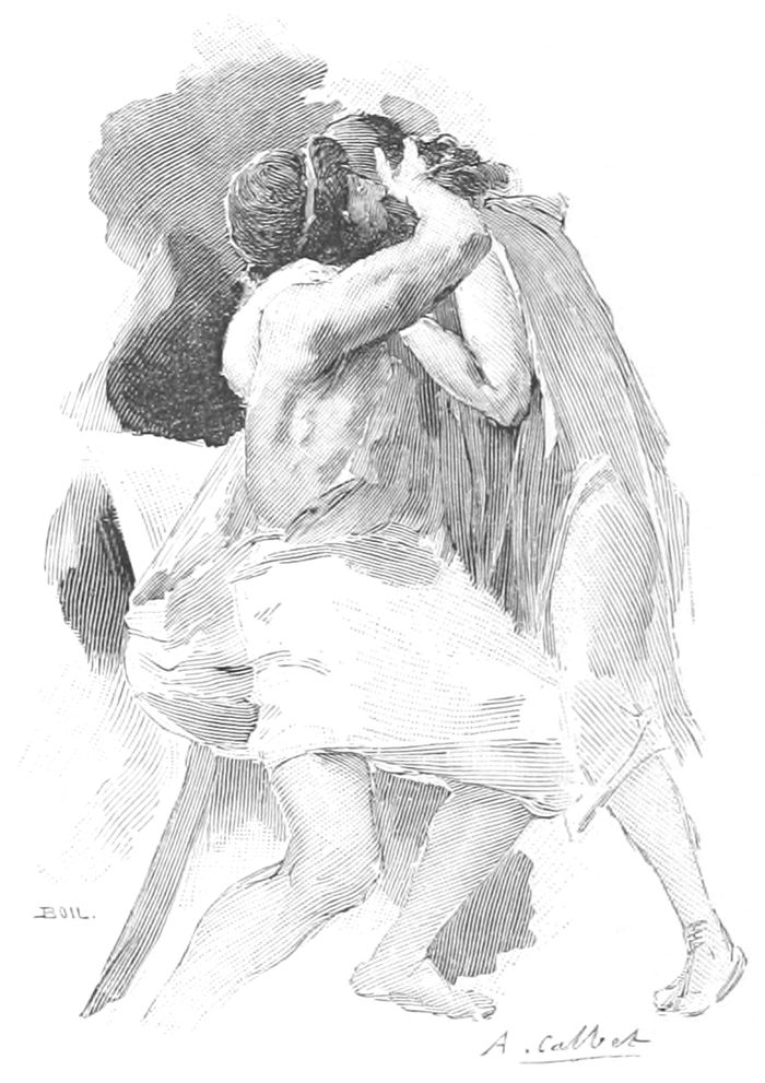 Cependant les prétendants orgueilleux remplissaient de leur tumulte le sombre palais; tous brûlaient d'amour pour la chaste épouse d'Ulysse, et souhaitaient partager sa couche divine. Le sage Télémaque, outré de leur audace, leur dit ces paroles rapides: