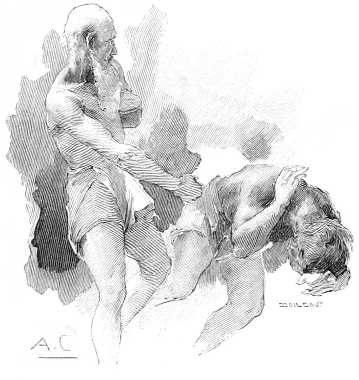 Ainsi parla Minerve, et Télémaque retourna au palais le cœur agité. Là, les fiers prétendants dépouillaient des chèvres et flambaient des porcs. Antinoos, riant, vint à Télémaque, lui prit la main et dit: