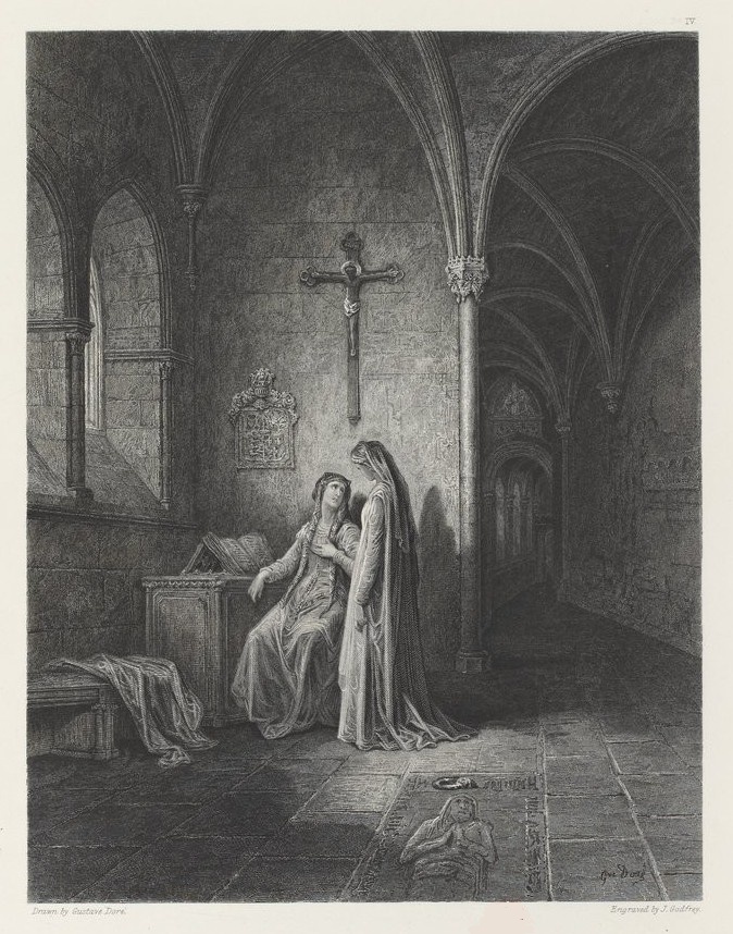 A ces mots, la Reine fit une réponse pleine de tristesse: «Enfant resserrée dans les murs d'un cloître, que sais-tu du monde, de ses rayons et de ses ombres, de toutes ses richesses et de toutes ses misères? Si jamais Lancelot, ce très-noble chevalier, cessa un seul moment d'être noble, prie pour lui qu'il échappe au feu éternel, et prie pour celle qui l'y a entraîné.