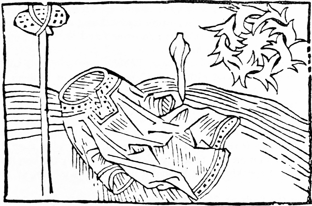A part of the crowne of our Lord Jesu wherewith he was crowned & one of the nayles, and the speare head and many other reliques are in France at Paris in the chapell of the King, and the crowne lyeth in a vessell of cristall wel dight and richly, for ye French King bought these reliques sometime of the Jewes, to whome the Emperour had laid them to pledge for a great sume of golde. And although men say that this Crowne was of thornes—ye shall understand that it was of Jonkes30 of the sea, which be white and pricketh as sharp as thornes, for I have seene and beheld many times that at Paris, and that at Constantinople, for they were both of one, and made of Jonkis of the sea. But men have departed him in two partes, of the which one parte is at Paris, and the other part at Constantinople, and I haue a point thereof that seemeth a white thorne, and that was given me for a great friendeship—for there are many of them broken and fallen into the vessell, when they shew the Crowne to great men or lordes that come theither. And ye shall understande that our Lord in that night that he was taken, he was led into a garden, and there he was examined sharply, & there the Jewes crowned him with a crown of abbespine31 braunches that grew in the same garden & set it on his head so fast, that the blood came downe by many places of his visage, necke, and shoulders, and therefore hath the abbespine many vertues, for he that beareth a braunche of it about him, no thunder, nor any maner of tempest may hurt him, nor the house that it is [pg 13] in may no evill ghost come, nor in no place where it is. And in that same garden Sainct Peter denied our Lord thrise. And afterward was our Lord led before the Bishop and ministers of the lawe into another gardein of Anne32 and there was he examined, scorned & crowned efte33 with a swete thorn that men called barbareus34 that grew in the same gardein and that hath many vertues. And afterward he was led to a gardein of Caiphas, and there he was crowned again with eglentine,35 and after that he was led to a chamber of Pilate & there he was crowned, and the Jewes set him in a chaire and clad him in a mantell of purpure36 and then made they a crowne of Jonkes of the sea and there they kneled to him & scorned him saying Ave rex Judeorum. That is to say, haile King of Jewes. And of this crowne, halfe is in Paris and the other halfe at Constantinople, the which our Saviour Jesu Christ hadde on his head, when he was nayled on the crosse, and therefore shall men honour and worship it, and holde it more worthy then any of the other. And the speare shaft hath the Emperour of Almaine, but the head which was put in his side is at Paris they say, in the holy chappell, and oft tymes sayth the Emperour of Constantinople, that he hath the speare head & I have often seen it, but it is greater than that at Paris. Also at Constantinople lyeth Sainct Anne our ladie's mother, whom Saint Elene caused to be brought from Hierusalem, and there lieth also the body of Saint John Chrisostome that was bishop of Constantinople. There lyeth also sainct Luke the Evangelist, for his bones were brought from Bethany where he was buried: and many other relyques are there, and there is of the vessell of [pg 14] stone as it were marble, which men call Idryus, that evermore droppeth water & fylleth himselfe every yeare once. And ye shall wete that Constantinople is a fayre citie and well walled & it is three cornered, and there is an arme of the sea that men call Hellespon, and some men call it the bunch37 of Constantinople and some call it the brace38 of sainct George, and this water encloseth two partes of the citie, and upward to the sea upon that water was wont to be the great citie of Troy in a fayre plaine, but that citie was destroyed by the Grekes.