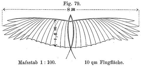 10. In kurzer, breiter Ausführung würden die Flügel eines Apparates von 10 qm Tragefläche eine Klafterbreite von 8 m bei 1,6 m größter Breite nach Fig. 79 erhalten.