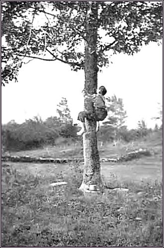 Going after the cows was a serious thing in my day. I had to climb a hill, which was covered with wild strawberries in the season. Could any boy pass by those ripe berries? And then in the fragrant hill pasture there were beds of wintergreen with red berries, tufts of columbine, roots of sassafras to be dug, and dozens of things good to eat or to smell, that I could not resist. It sometimes even lay in my way to climb a tree to look for a crow's nest, or to swing in the top, and to try if I could see the [Pg 17] steeple of the village church. It became very important sometimes for me to see that steeple; and in the midst of my investigations the tin horn would blow a great blast from the farm-house, which would send a cold chill down my back in the hottest days. I knew what it meant. It had a frightfully impatient quaver in it, not at all like the sweet note that called us to dinner from the hayfield. It said, "Why on earth doesn't that boy come home? It is almost dark, and the cows ain't milked!" And that was the time the cows had to start into a brisk pace and make up for lost time. I wonder if any boy ever drove the cows home late, who did not say that the cows were at the very farther end of the pasture, and that "Old Brindle" was hidden in the woods, and he couldn't find her for ever so long! The brindle cow is the boy's scapegoat, many a time.