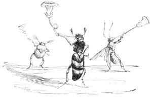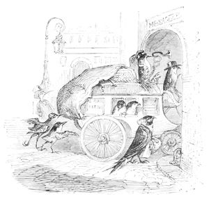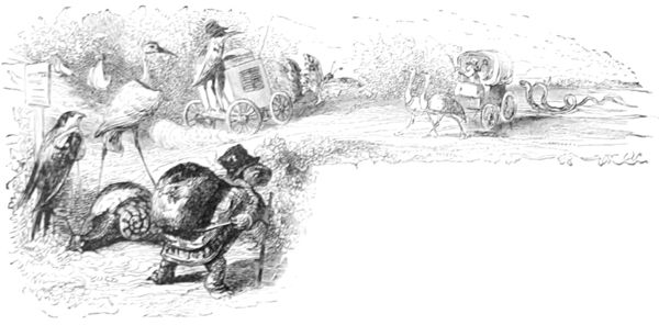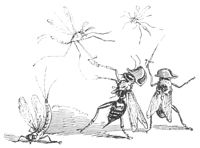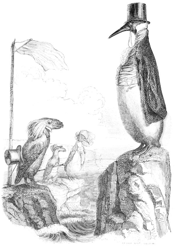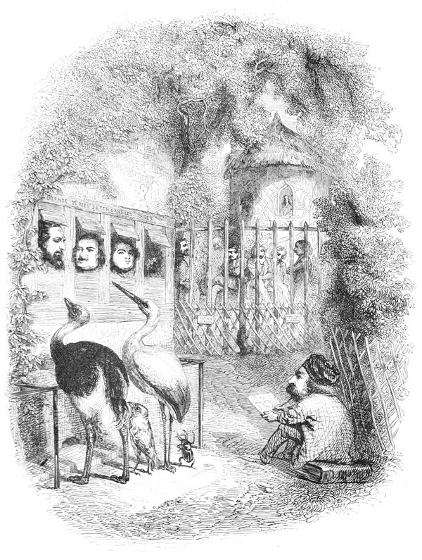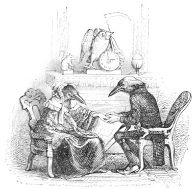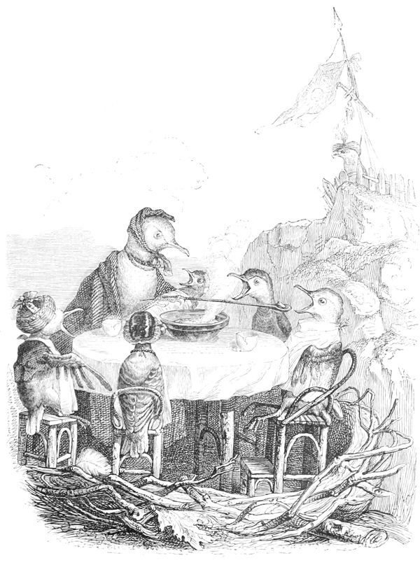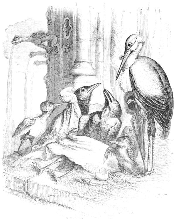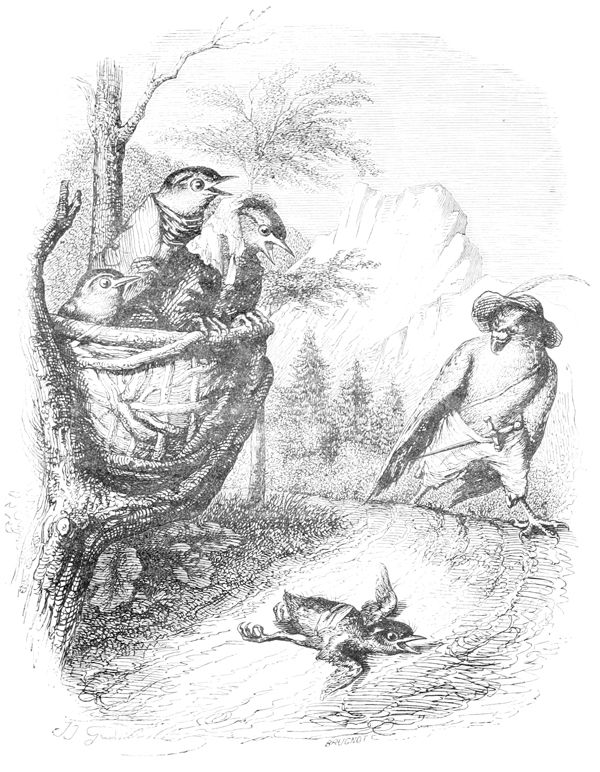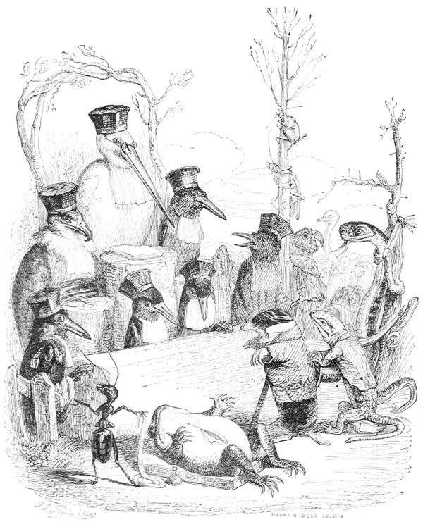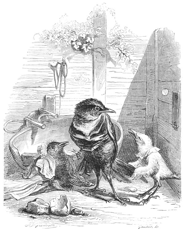 La Buse contemple avec respect ces deux savants latinistes.—L’Oiseau-Moqueur fait remarquer au Merle qu’il y a un moyen infaillible de passer dans le monde pour un Animal instruit, c’est de parler à chacun de ce qu’il ne sait pas.—