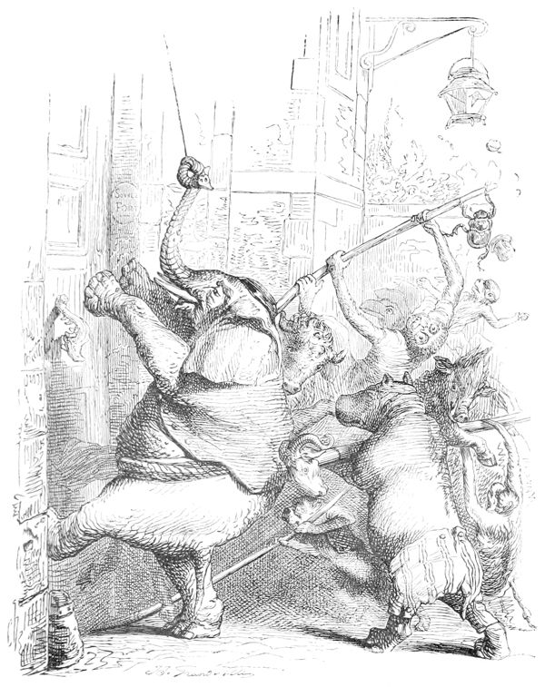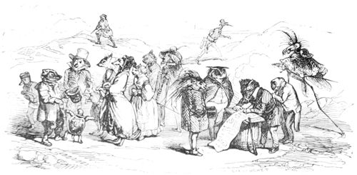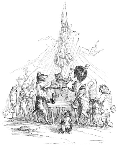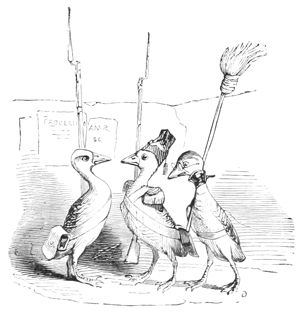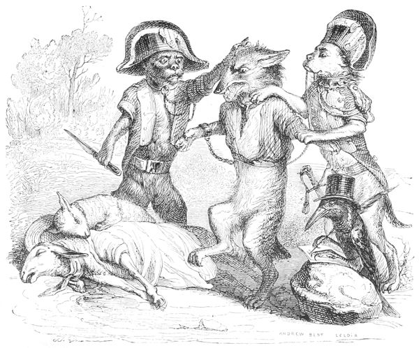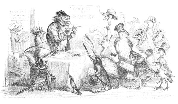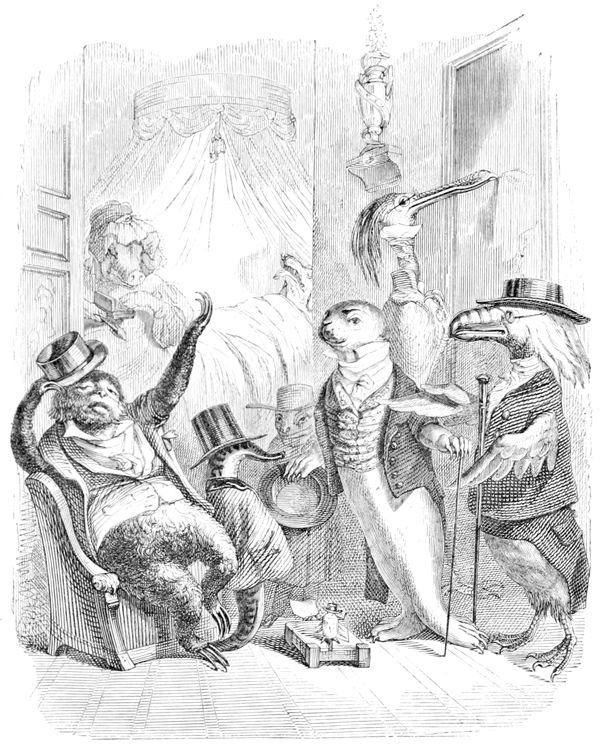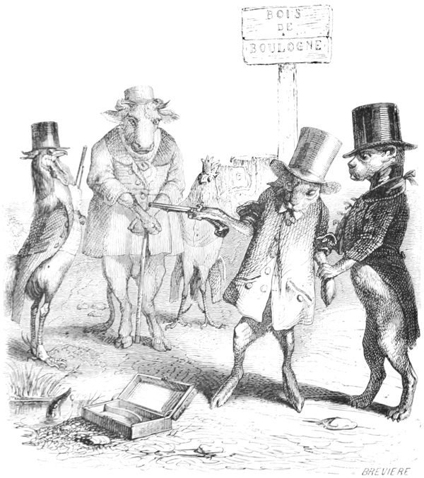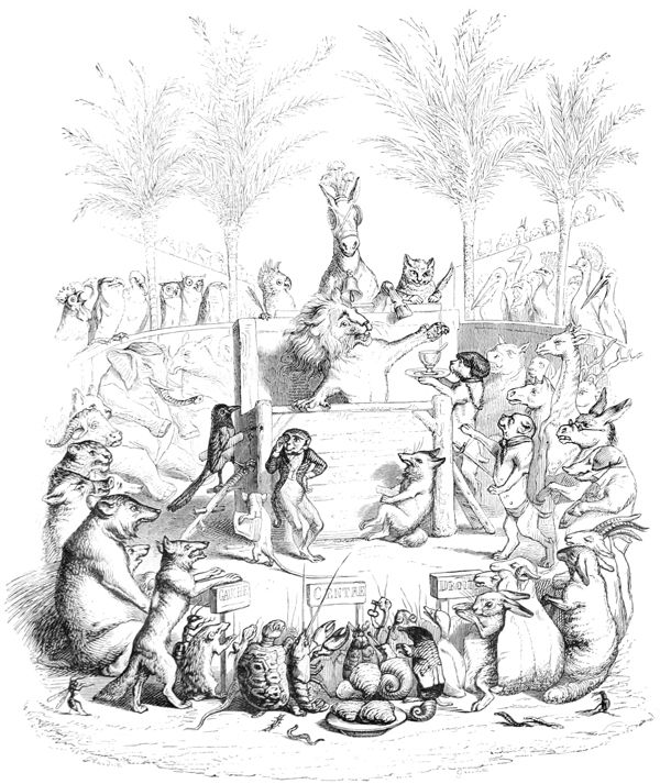 L’Histoire des Chartes n’a rien de comparable à ce qui s’est passé dans ce milieu d’illustrations Herbivores et Carnivores. Les Hyènes ont été sublimes d’énergie et les Oies attendrissantes. Tous les représentants se sont embrassés à la fin de la séance, et, dans cette effusion d’accolades, il n’y a eu que deux ou trois petits accidents à déplorer: un Canard a été étranglé par un Renard ivre de joie, un Mouton par un Loup enthousiasmé, et un Cheval par un Tigre en délire. Comme ces Messieurs étaient en guerre depuis longtemps avec leurs victimes, ils ont déclaré que la force du sentiment et de l’habitude les avait emportés, et qu’il ne fallait attribuer ces légers oublis des convenances qu’au bonheur de la réconciliation.