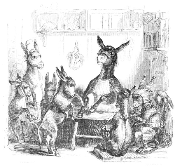 Il dit d’une voix conciliante qu’il s’étonne qu’une question préliminaire, d’une moindre importance que toutes les autres, soulève d’aussi graves débats.—Il loue l’Ane de sa bonne volonté et le Loup de sa vertueuse colère, mais il fait observer que le temps presse, que la lune pâlit, et qu’il faut se hâter.