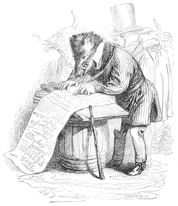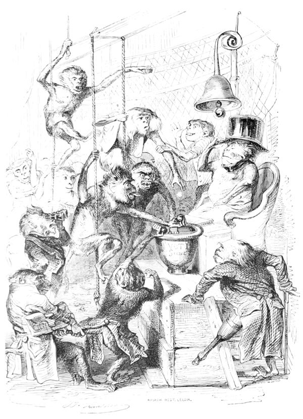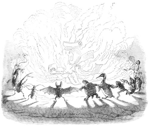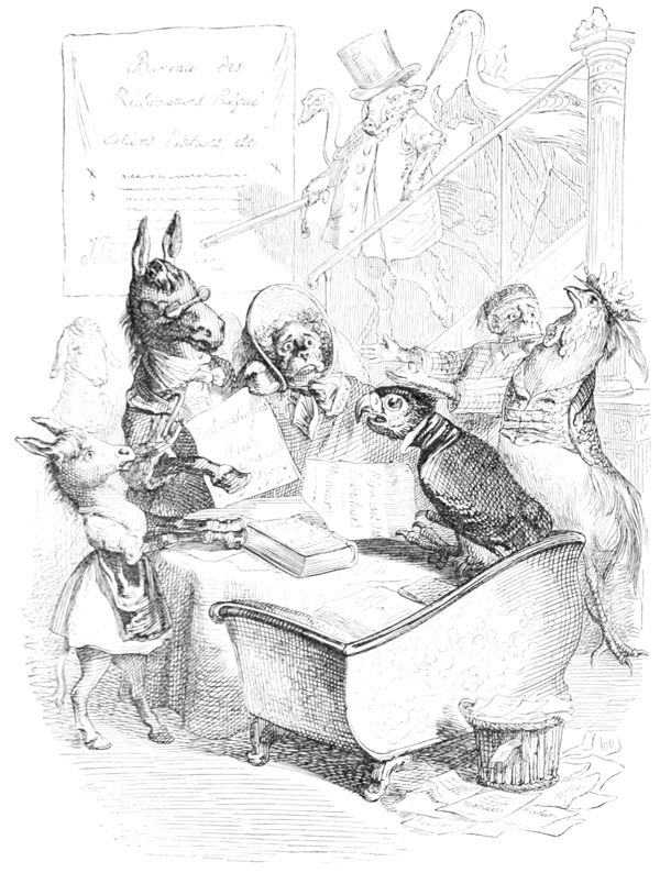 Discours du Singe, d’un Corbeau instruit et d’un Hibou allemand.—L’Ane prend la parole sur la question préliminaire de la présidence (son discours est écrit).—Réponse du Renard.—Nomination du Président.—Questions relatives à la répression de la force brutale de l’Homme et à la réfutation des calomnies qu’il accumule depuis le déluge sur la tête des Animaux.—Chacun apporte ses lumières.—Les Animaux sauvages veulent la guerre, les Animaux civilisés se prononcent pour le statu quo.—Toutes les questions à l’ordre du jour sont successivement discutées par les honorables membres de cette illustre assemblée.—Discours résumés du Lion, du Chien, du Tigre, d’un Cheval anglais pur sang, d’un Cheval beauceron, du Rossignol, du Ver de terre, de la Tortue, du Cerf, du Caméléon, etc., etc., etc.—Le Renard répond à ces divers orateurs, et met tout le monde d’accord au moyen d’une transaction.—Adoption de sa proposition.—La présente publication est décrétée.—Le Singe et le Perroquet sont nommés Rédacteurs en chef.