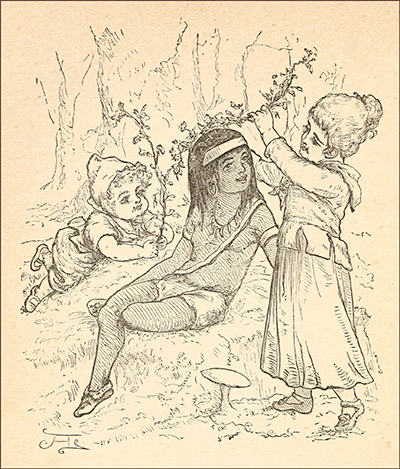 Late into the night did they all sit over the fire, while Fritz told the story of his seven long years of absence. It seemed to the children very exciting; for Fritz had twice been shipwrecked, had seen a buffalo, and only just escaped being killed by an Indian! He had228 been very poor too, and suffered such hardships that he could not bear to write home the tidings of his ill-luck. But now things were better. Out on the Western frontier of the United States (here Max and Thekla smiled at each other and thought of “Chusey”) he had found employment and kind friends, and managed to save from his wages enough to buy a little farm. He told of the oaks, the noble rivers, the plentiful food and rich soil, the splendid colors of the autumn forest.