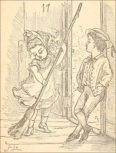 Just then a naughty idea entered into Max’s head. “We’ll see whether that is true,” he muttered;14 and, watching till the old man’s back was turned, he plunged his fingers into the jar, stole a double handful of the sand, and hid it in the tin can which was slung to his side, and in which his dinner and Thekla’s had been. Old Time was too busy to heed him. Pretty soon after, Max took Thekla’s hand, and, without saying “Good-by,” dragged her away down the narrow path towards home. It was almost nightfall when at last they got there.