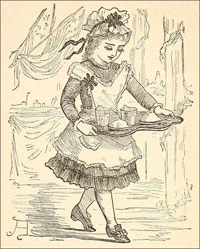“Here,” said February; and he pulled from his pocket something that looked like a big icicle. It was an icicle, only it didn’t melt in your fingers or feel cold; and it had a delicious taste, like buckwheat cakes, maple molasses, sausages, baked apples, turkey, cranberry sauce, and nuts and raisins, all at once. Max broke it in two, and while Thekla sucked one half and he the other, February began:—