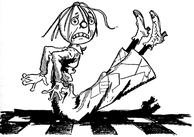 In olden Oz times the Mudgers used to descend upon the helpless little countries that surrounded them and carry off everything of value. But Glinda, the good sorceress of Oz, put a stop to that. One night, flying over Mudge in her swan chariot, she had dropped a blue book and it had fallen on the oldest Mudger in the kingdom, hitting him a terrible blow on the nose. It had been a blow to them all, for in gold letters on the first page of the book stood this sentence: