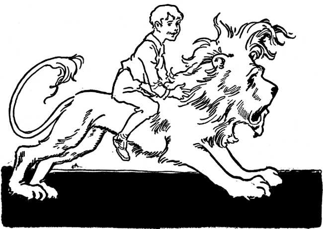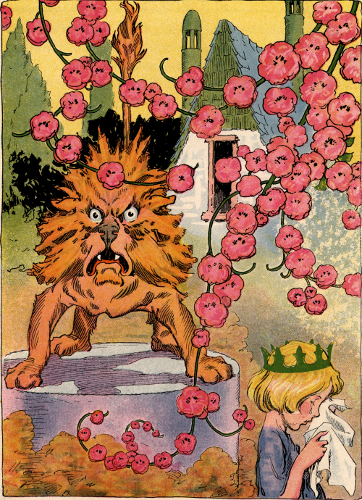 "The Cowardly Lion is one of the most unusual and celebrated lions in Oz. For many years he ruled over the forest kingdoms, but in the reign of the famous Wizard of Oz the Cowardly Lion was discovered by a little Kansas girl named Dorothy. He became so attached to Dorothy that he accompanied her on her journey to the Emerald City, saving her life many times on the way, and proving so brave, in spite of his cowardice, that he won the love and admiration of all Oz. Since then he has spent most of his time in the capital city, sharing in all the adventures of court celebrities, and of Dorothy, who has been made a Royal Princess. He has, by his many brave deeds, endeared himself to the whole populace and—"
