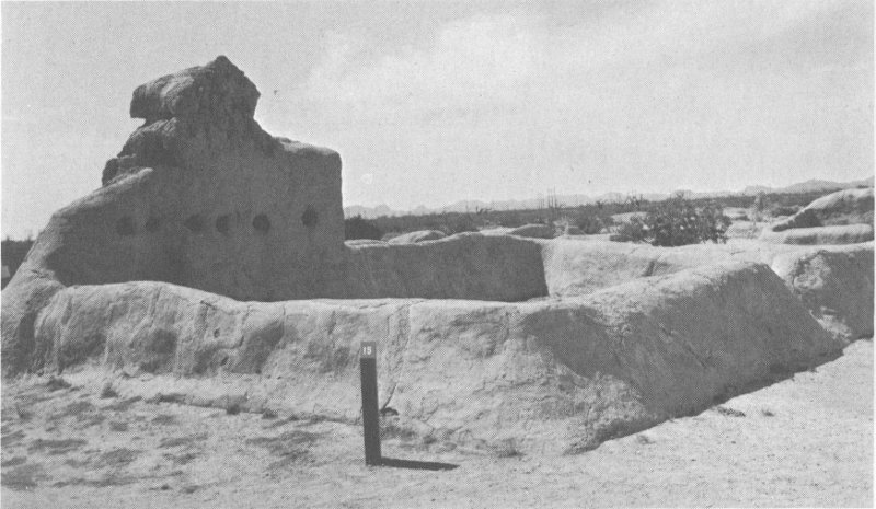 The high walls shown at top of the next page are all that remain of a three-story building that stood in this southwest corner of the walled village. These rooms apparently were living rooms where several families slept, worked, and stored their food, tools, and clothing. One of the large red Hohokam jars in the Visitor Center exhibit room was recovered near here.