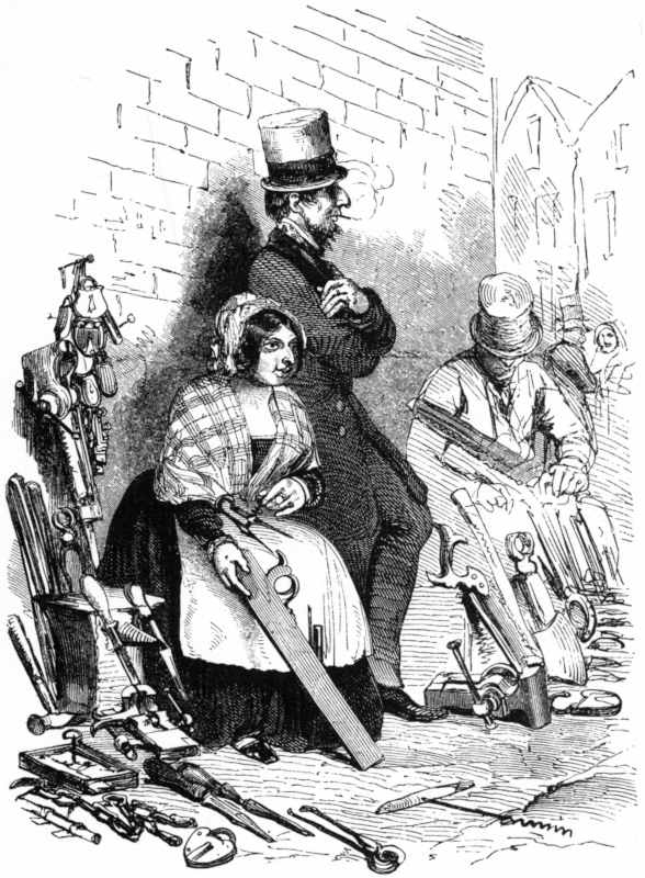 1. The Street-Sellers of Old Metal Articles, such as knives, forks, and butchers’ steels; saws, hammers, pincers, files, screw-drivers, planes, chisels, and other tools (more frequently those of the workers in wood than of other artisans); old scissors and shears; locks, keys, and hinges; shovels, fire-irons, trivets, chimney-cranes, fenders, and fire-guards; warming-pans (but rarely now); flat and Italian irons, curling-tongs; rings, horse-shoes, and nails; coffee and tea-pots, urns, trays, and canisters; pewter measures; scales and weights; bed-screws and keys; candlesticks and snuffers; niggards, generally called niggers (i. e., false bottoms for grates); tobacco and snuff-boxes and spittoons; door-plates, numbers, knockers, and escutcheons; dog-collars and dog-chains (and other chains); gridirons; razors; coffee-mills; lamps; swords and daggers; gun and pistol-barrels and locks (and occasionally the entire weapon); bronze and cast metal figures; table, chair, and sofa castors; bell-pulls and bells; the larger buckles and other metal (most frequently brass) articles of harness furniture; compositors’ sticks (the depositories of the type in the first instance); the multifarious kinds of tin-wares; stamps; cork-screws; barrel-taps; ink-stands; a multiplicity of culinary vessels and of old metal lids; footmen, broken machinery, and parts of machinery, as odd wheels, and screws of all sizes, &c., &c.