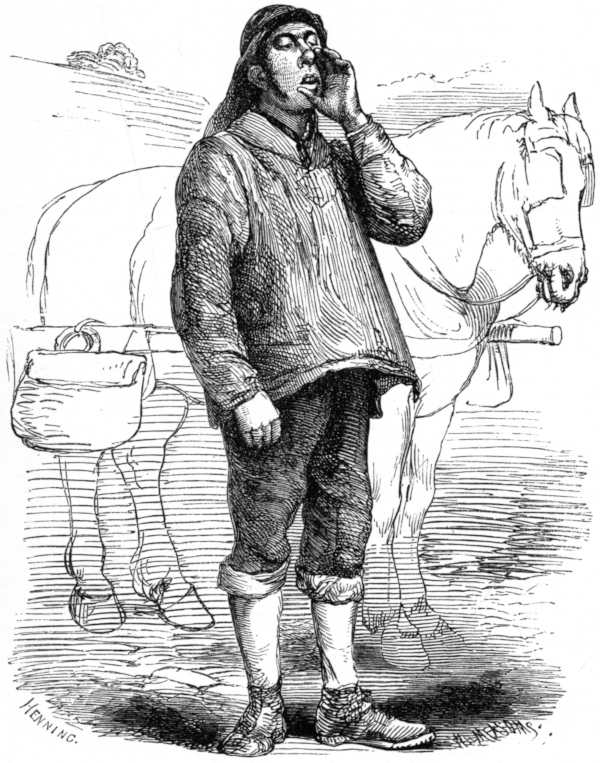 The value of the Capital, or Stock in Trade, of these people, though individually trifling, amounts, collectively, to a considerable sum of money—indeed, to very nearly 40,000l., or at the rate of about 1l. per head. Under the term Capital are included the donkeys, barrows, baskets, stalls, trays, boards, and goods belonging to the several street-traders; and though the stock of the water-cress, the small-ware, the lucifer, the flower, or the chickweed and groundsell seller may not exceed in value 1s., and the basket or tray upon which it is carried barely half that sum, that of the more prosperous costermonger, possessed of his barrow and donkey; or of the Cheap John, with his cart filled with hardware; or the Packman, with his bale of soft wares at his back, may be worth almost as many pounds as the others are pence.