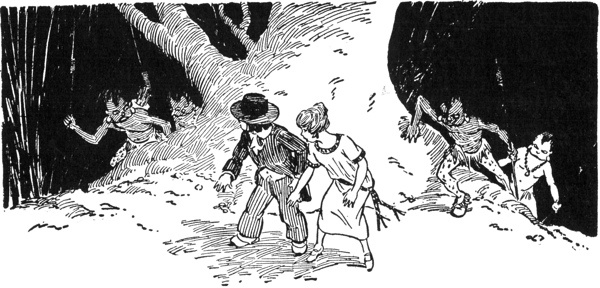 The Lady of Fashion and the Poet had gone to the bank of the creek for a picnic. They had eaten their lunch and the Lady of Fashion suggested that they walk down the stream in search of wild flowers. They had only gone a little ways when the wild men, who had been watching them, suddenly leaped upon them from behind a big bush. In a few seconds the wild little fellows had carried their tiny prisoners to their canoe, after having securely bound their hands behind them. Lifting the Teenie Weenies into the boat the wild men jumped in after them and began to paddle down the creek.