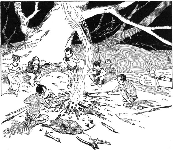 In spite of the fact that the Teenie Weenies were terribly worried, the roasting meat smelled wonderfully good and when it was done the prisoners’ hands were untied and they were each given a piece. Both ate a good portion and agreed that it was delicious. They wiped their fingers on a leaf and then the wild men tied their hands again and made them understand that they were to sleep.