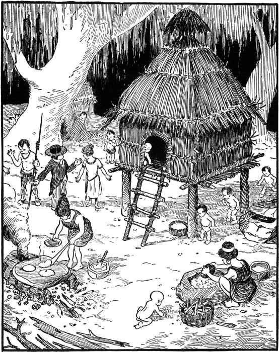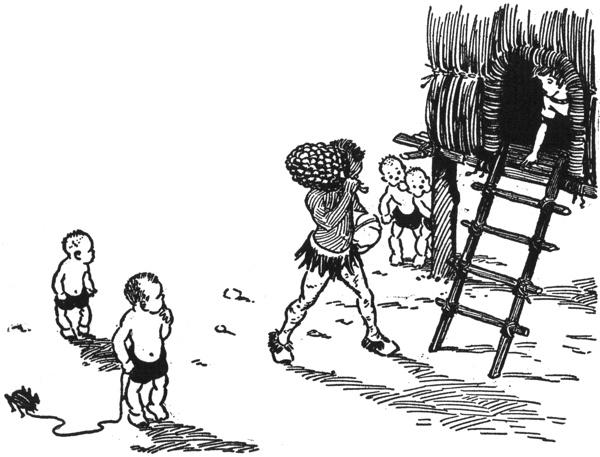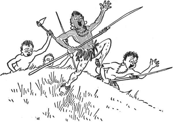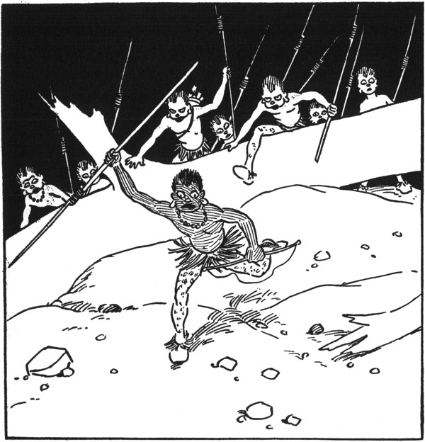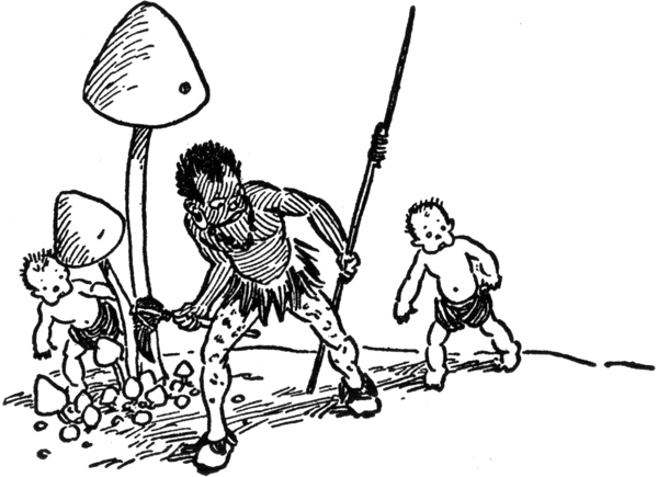 Two days later they landed on the island where the wild men lived. When the two Teenie Weenies stepped out of the canoe a great number of the wild little people came running toward them. The women and children stared at them in great astonishment, while the men danced and swung their clubs and spears in a most terrible way.