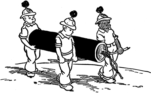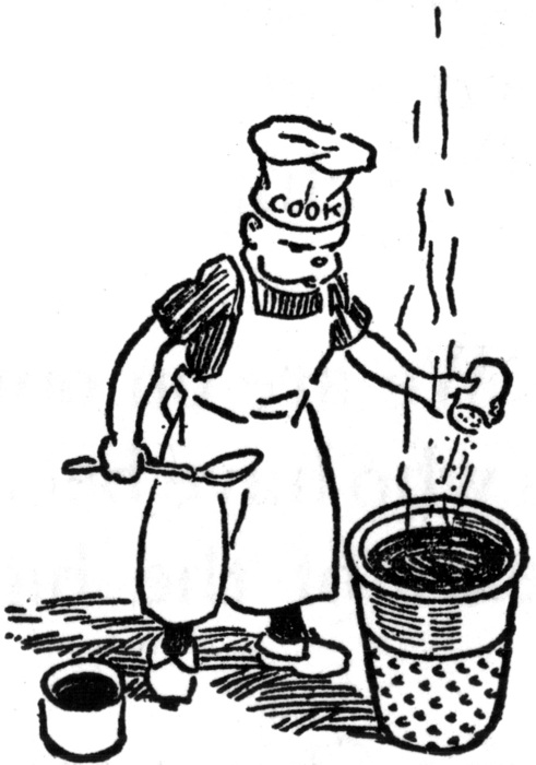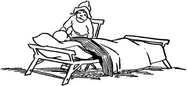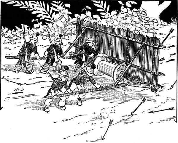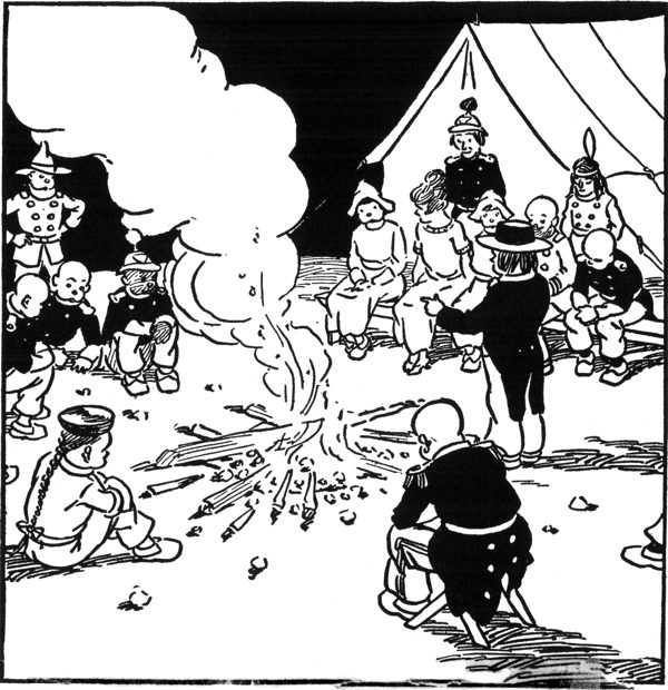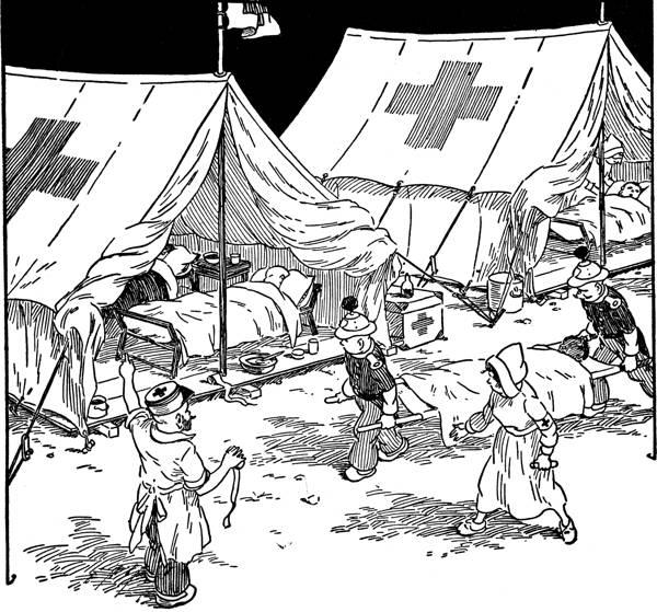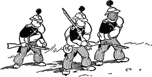 The first day’s march was very hard on the soldiers, for the sun was hot and the little fellows were not used to such long tramps. When the order came for the army to break ranks and make camp ready for the night, the soldiers worked with a will unloading the wagons and putting up the tents. The kitchen tent was put up first so the Cook and the Chinaman would lose no time in getting dinner ready for the hungry army.