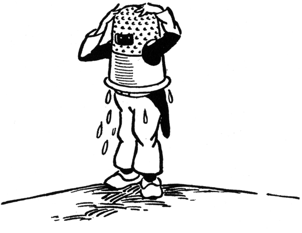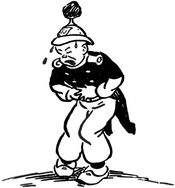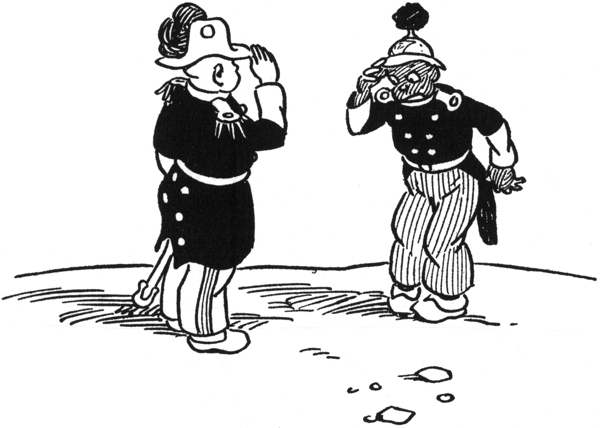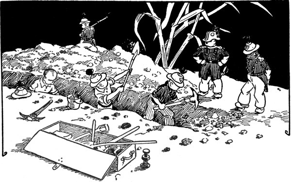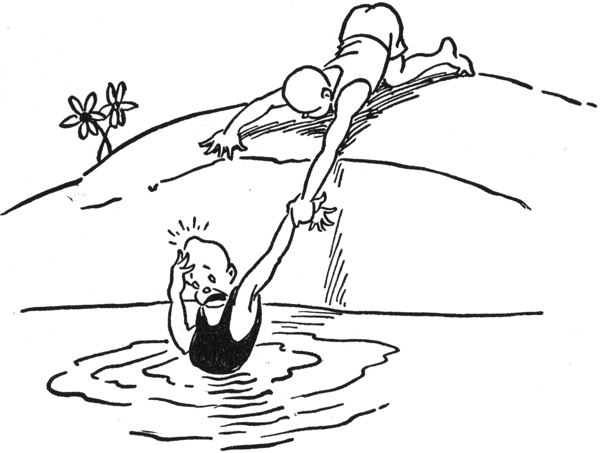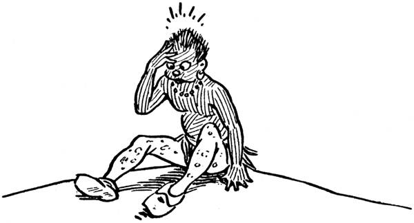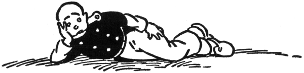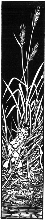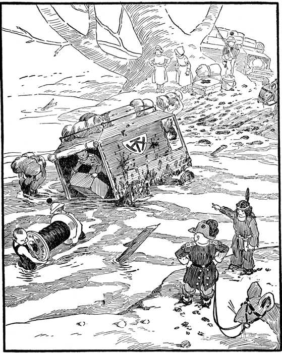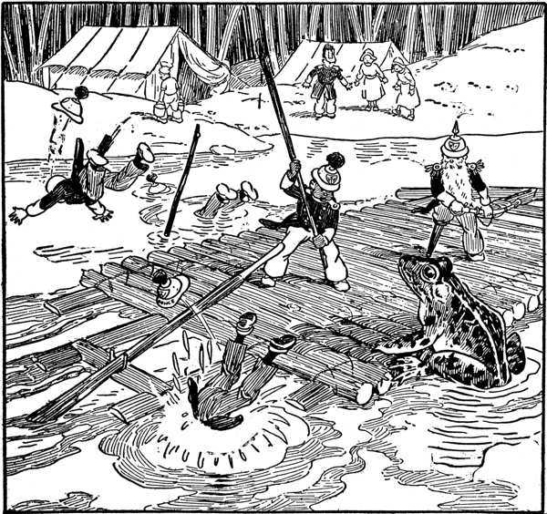 After dinner the little soldiers gathered on the bank of a puddle of water, where they bathed their aching feet, while others took off their uniforms and enjoyed a good swim. The foolish Dunce dived head first into the pool without first testing the water to see how deep it was and he nearly broke his silly neck, for the hole was only three Teenie Weenie feet (a little over an inch and a half) deep.