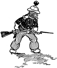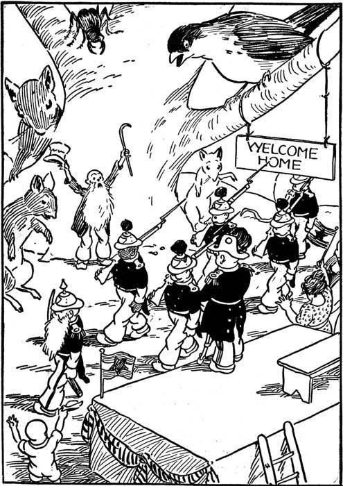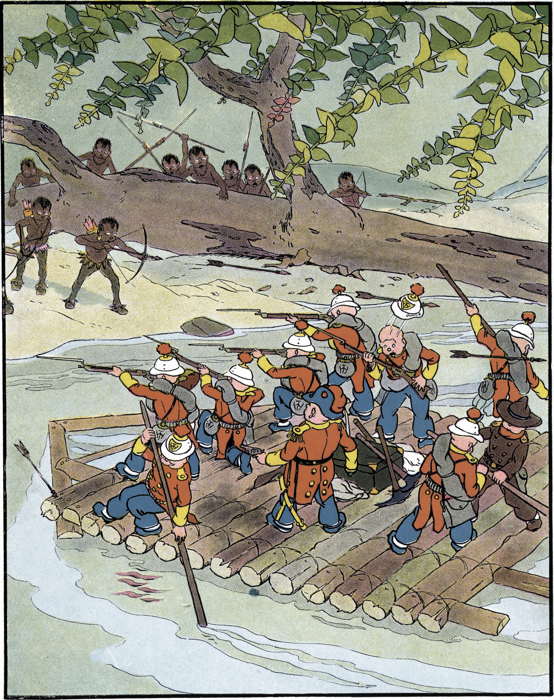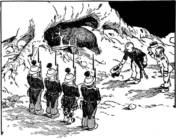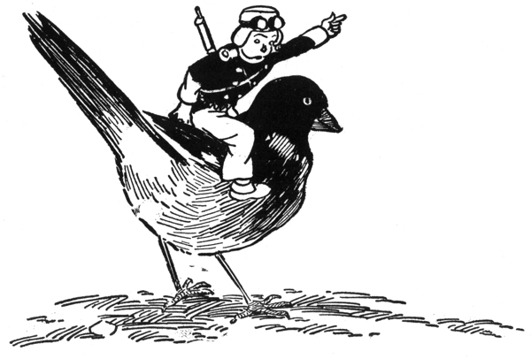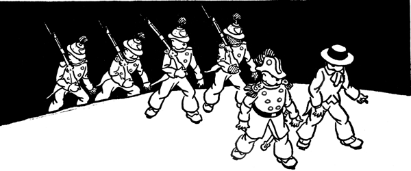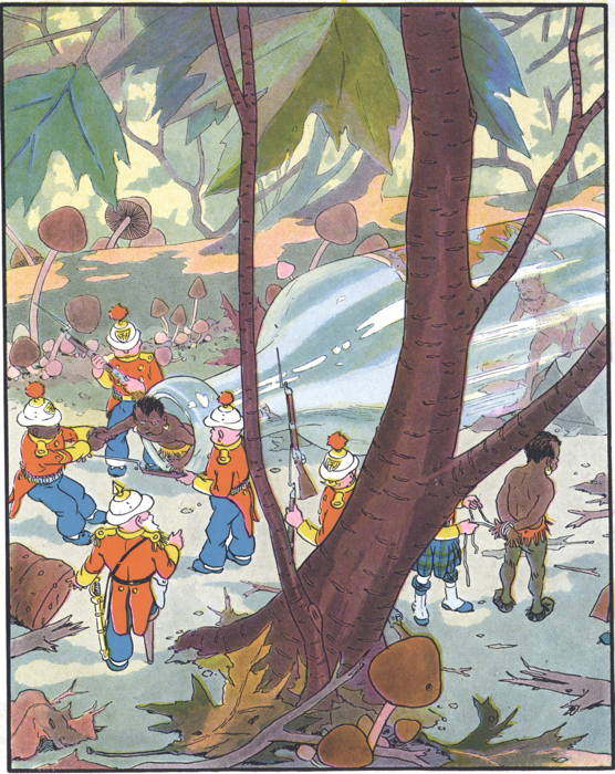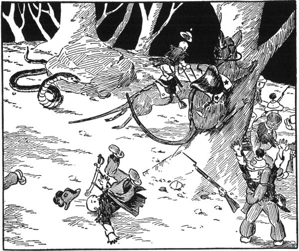 When the little soldiers had said their last good-byes, the men stepped into line and at the gruff command of the General they swung away towards the great forest in which the wild men lived. The Indian and the Cowboy, mounted on mice, rode ahead of the army and picked out the best and easiest road for the soldiers, while the Turk, who was chosen as the aviator, flew above the army on the back of a bird, ever watchful for enemies.