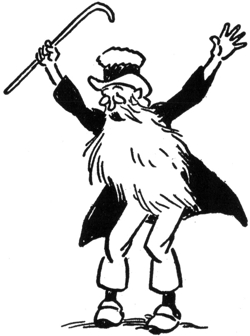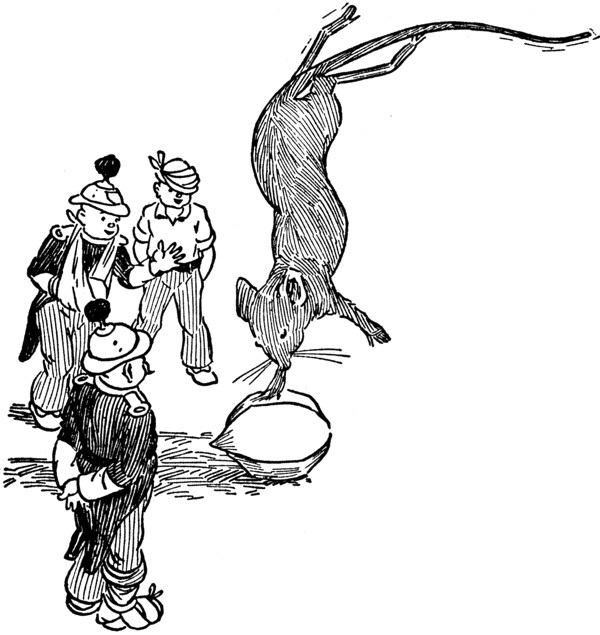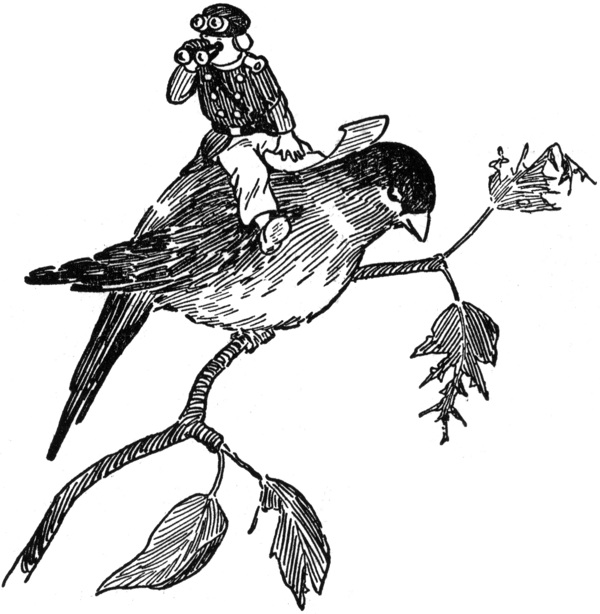 Several of the Teenie Weenies ran to the old derby hat which served the little people as a school house and armory, and began furiously to ring the tiny bell. All the birds and animals who lived near the little village knew that when the bell rang long and loud it was a signal for them to come. In a few minutes, two birds flew under the rose bush where the village stood and one by one, several mice, a squirrel and a couple of intelligent-looking bugs appeared.