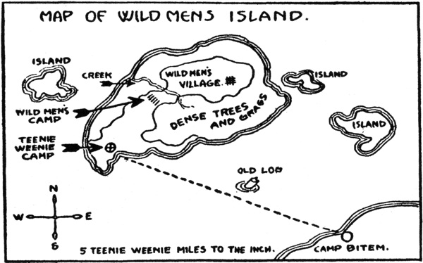 The Teenie Weenies had known for some time that a tribe of tiny wild men lived in a big swamp many teenie weenie miles from the shoe house. Field mice and birds had carried the news of these strange little people to the Teenie Weenies. The wild men lived in the heart of a big forest and they spoke a language quite different from the Teenie Weenies.