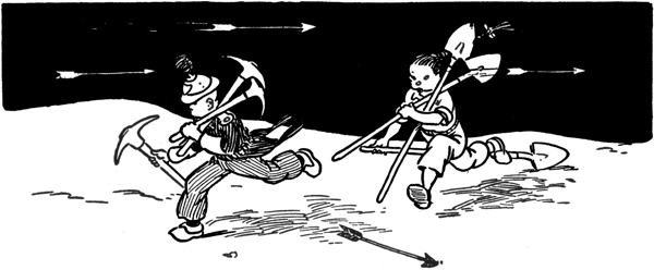 As the canoe floated along down the stream the Lady of Fashion and the Poet spent their time studying the strange little wild men, or Saboes, as they were called. They were sturdily built little chaps, but a trifle smaller than the Teenie Weenies. They had dark brown skins, bushy hair, and around their fierce-looking eyes were painted circles of white. One or two of the wild men wore shirts with skirts almost to their knees, but the most of them were dressed only in trousers which were made from the skins of young frogs. Their spears were made of long sticks with a sharp fish bone tied to the end, and several of them carried bows and arrows, while their war clubs were made by fastening sharp blackberry thorns to a short handle. Many of the little wild men wore strings of beautifully carved raspberry beads about their necks and arms, which the little fellows called “gum gum,” the Sabo name for money.