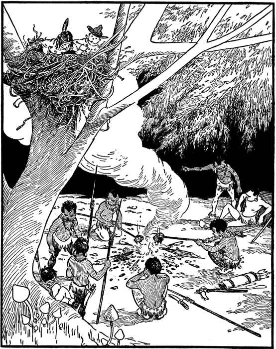 But the two Teenie Weenies never came close enough to a bird all that day, for the wild men paddled their canoe near the shore of the creek under the cover of the overhanging ferns and grass.