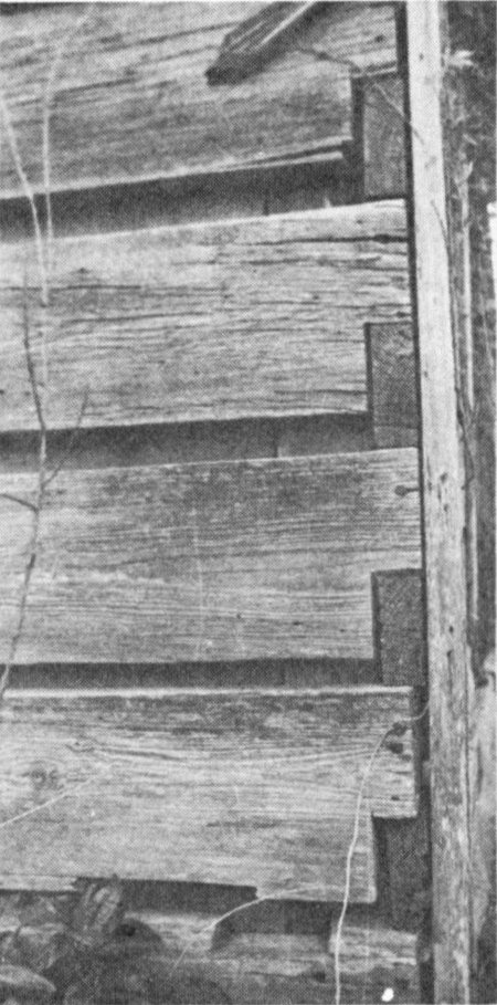 Some of the houses were built with whole peeled logs (Fig. 4); others with split logs (Fig. 5) and still others with square-hewn logs (Fig. 6). The logs were notched or “scribed” at the corners to fit securely and steadily. The style of the notch varied with the cultural background, skill or preference of the builder. Saddle notching, V-notching, Half-dovetailing, Square cornering, Halved cornering and a saddle-V combination are found in the Piney Woods (Figs. 7-12). Of these, the half-dovetail is the most difficult to produce. It is self locking, as is the Saddle and V-notch, while the Square and Half-Square require the use of pegs to hold the timber in place.