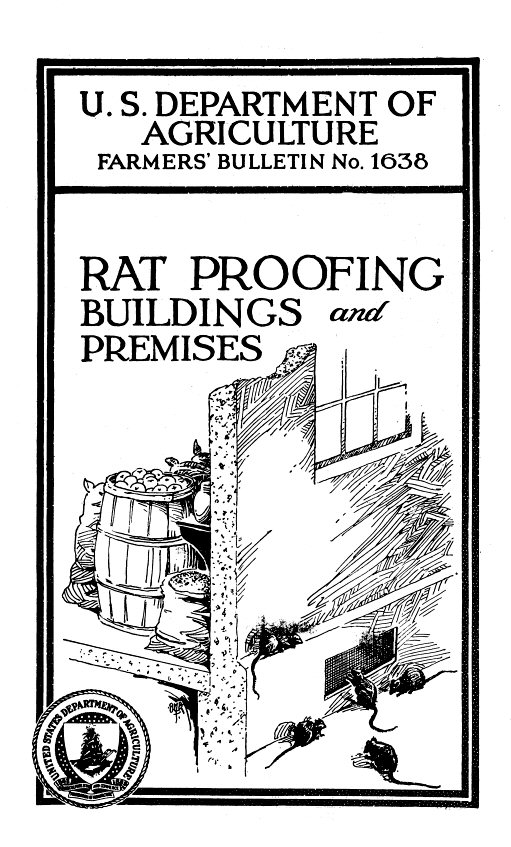 FOOD AND SHELTER are as essential to rats as to other animals, and the removal of these offers a practical means of permanent rat control. The number of rats on premises and the extent of their destructiveness are usually in direct proportion to the available food supply and to the shelter afforded. Rat proofing in the broadest sense embraces not only the exclusion of rats from buildings of all types but also the elimination of their hiding and nesting places and cutting off their food supply. Through open doors and in other ways, rats may frequently gain access to structures that are otherwise rat proof, but they can not persist there unless they find safe retreats and food. When rat proofing becomes the regular practice the rat problem will have been largely solved.