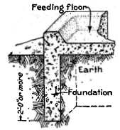 Concrete feeding floors, troughs (fig. 11), water tanks, hog wallows, and similar structures should be constructed with a curtain wall, or apron, around the outer edge extending 2 feet or more into the ground (fig. 12) to keep the rats from burrowing underneath the slab. This also tends to prevent the heaving caused by frost and the uneven settling of the structure in soft ground.