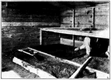 The grain bin and other similar fixtures must always be considered in rat proofing a barn. It is most important that they be so situated « 6 » or constructed that there shall be no hiding places for rats behind or under them. The grain bin should be completely lined or covered with metal and should have metal-clad lids. Any open spaces behind or under the bins should be tightly closed with metal. (Fig. 6.)