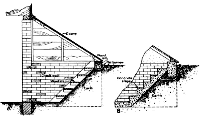 Outside cellars frequently become infested with rats, and great havoc to stored produce almost invariably results. Considerable expense, if necessary, is justified in making the storage cellar rat proof. A cellarway with wooden steps and sills and earth floor is usually the source of the trouble. The sill soon rots or the rats burrow under it to gain entrance. The remedy is to construct a concrete floor and cellarway. This not only will exclude rats but will prove more economical in the long run. (Fig. 15.)