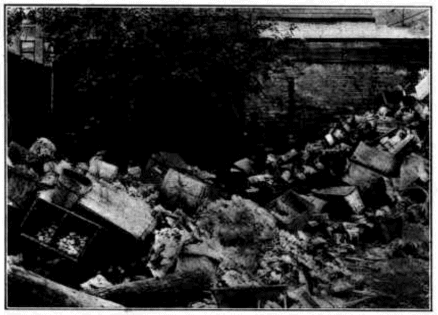 Large accumulations of trash usually, contain much waste food (fig. 16) and are certain to attract rats and furnish an ideal breeding place for them. Furthermore, they are a menace to health and should not be tolerated under any circumstances. All other rat harbors, such as wooden floors and sidewalks very near the ground, should be removed or replaced with concrete, and piles of lumber and various materials stored out of doors should be removed or elevated 18 or more inches. Particular care should be taken to see that sheds and other outbuildings, porches, steps, loading platforms, and similar structures on the premises are made rat proof, either by the use of concrete, by elevation, or by keeping them open to the light and easily accessible.