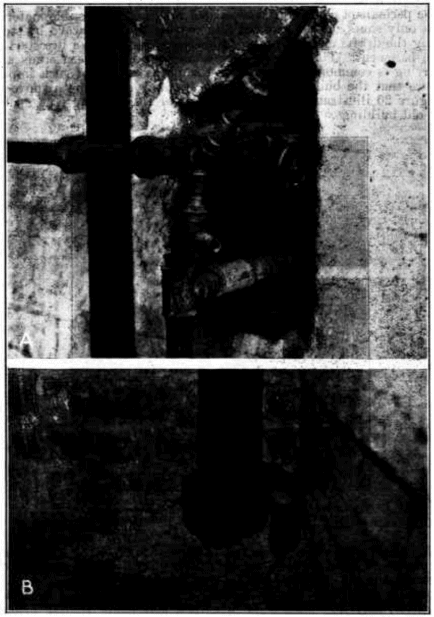 Side walls should be carefully inspected, and all openings made for plumbing (fig. 18), electric-wire conduits, areas around windows and doors, and unpointed joints in masonry walls (frequently left when the exterior of the wall is hidden from public view by porches or platforms) should be carefully closed with cement mortar. (Fig. 19.)