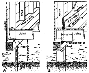 Buildings that have neither basements nor continuous masonry foundations present more difficult rat-proofing problems. The most effective procedure is to construct a concrete foundation wall between the existing supports and, after the wall has hardened, remove the supports, if of wood, and replace them with concrete to make the wall continuous. Where the cost prohibits following this plan and where the supporting sill and joists are at least 2 feet above the ground level, satisfactory rat proofing may be attained by stopping « 18 » the spaces between the studs with weak concrete or other material resistant to rats for a distance of 8 inches above the floor level, or with galvanized-metal flashing nailed to the joists, plate, and floor. (Fig. 21.) The space beneath the building must be free from all rubbish and other material that would afford shelter for rats. A continuous masonry foundation, with screened openings to provide ventilation, presents a more pleasing appearance.