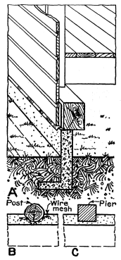 If the clearance between the ground level and the bottom of girders and joists is less than 2 feet, it may provide a hazardous rat harbor. One of three things should be done: The building should be elevated on piers 2 feet above the ground; a concrete foundation should be built as described above; or a continuous concrete curtain wall should be constructed under the entire outer wall of the building. (Fig. 22.)