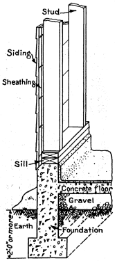 The use of concrete in the construction of most farm buildings is usually the best means of permanently excluding the rat. Fortunately, many of the fundamentals of rat proofing are also principles of good construction. As am example, in order to support a building properly, the foundation should extend well into the ground below the frost line; rat proofing likewise requires that the foundation wall extend at least 2 feet below the surface. Rats seldom burrow deeper than 2 feet unless natural passageways assist. Foundation walls should project a foot or more above the ground in order to protect the wooden parts of the building, and this also lessens the opportunity for rats to gnaw through the wall. A rat is not likely to cling to the exposed exterior of a building a foot above the ground while it gnaws a hole through wooden sheathing or siding. It would do so very quickly, however, if such siding extended to the ground, where its work could be under cover of vegetation or behind some object, particularly when the siding becomes somewhat rotted, as would soon happen were it close to the ground.