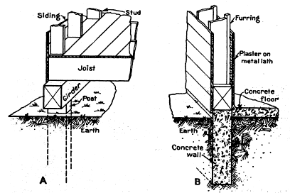 Basement ceilings, when accessible to rats, cause much trouble, and frequently the best remedy is to remove them entirely. In frame construction spaces between studs in walls opening into basements also are a common cause of rat infestation of the whole building. The permanent closing of these spaces with noncombustible material not only shuts out the rats but also reduces the fire hazard by stopping the drafts and the rising of heated gases should a fire start in the basement. This process of blocking spaces between studs and furring is commonly known as fire stopping and is of such importance that the building regulations of many cities now require it. Figure 20 illustrates practical methods of rat proofing stud spaces in old buildings.