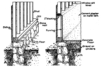 Rock foundations in many old barns offer excellent harborage for rats unless pointed carefully with cement mortar. If possible, the floor should be raised to the level of the sill and the walls plastered to the window-sill level (fig. 5) in such manner as to prevent access by rats to spaces between the studs.