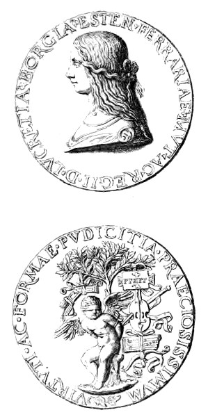 286. Devo alla bontà del signor Giulio Friedländer, direttore del Gabinetto numismatico di Berlino, una copia in gesso della medaglia colà esistente, e che è l'esemplare più perfetto tra quelli che se ne trovano (in Ferrara, Modena e Bologna). L'incisione è presa dal rame stesso, che il signor Friedländer fece disegnare pel suo scritto sulla medaglia di Lucrezia: Eine Schaumünze der Lucrezia Borgia von Filippino Lippi, ne' Berliner Blätter für Munz = Siegel= und Wappen = Kunde. Bd. III, Berlin, 1806. In quello scritto il lettore può vedere ciò che l'esimio Numismatico ha detto a proposito della medaglia e del tempo dell'impressione. Egli pensa che nel gennaio 1502 ne fu fatto in Bologna il modello in cera, che non venne poi eseguito che nel 1505, quando Lucrezia era divenuta di fatto duchessa di Ferrara.
