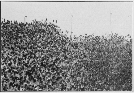 Crimson clover grows rapidly in early spring and furnishes an abundance of early grazing (fig. 5). If planted early and an abundant fall growth is made, the clover may also be grazed during the fall and winter months. Such a practice has been successfully followed in Tennessee, where crimson clover has provided the winter pasturage. The grazing, however, should be restricted to periods when the soil is relatively dry, otherwise damage may result from trampling. Animals grazing on crimson clover seldom bloat; however, it is advisable [Pg 7] not to turn them into clover fields for the first time when they are hungry. Bloat is less likely to occur when a mixture of clover and grass or grain is grazed than when the clover alone is grazed. As crimson clover reaches maturity the hairs of the heads and stems become hard and tough. When grazed continuously or when fed as hay at this stage of maturity large masses of the hairs are liable to form into hair balls in stomachs of horses and mules. Occasionally the hair balls are responsible for the death of animals. If small amounts of other feeds, particularly roughages, are fed along with the clover, the formation of these balls will be reduced. Cattle, sheep, and swine do not seem to be affected.