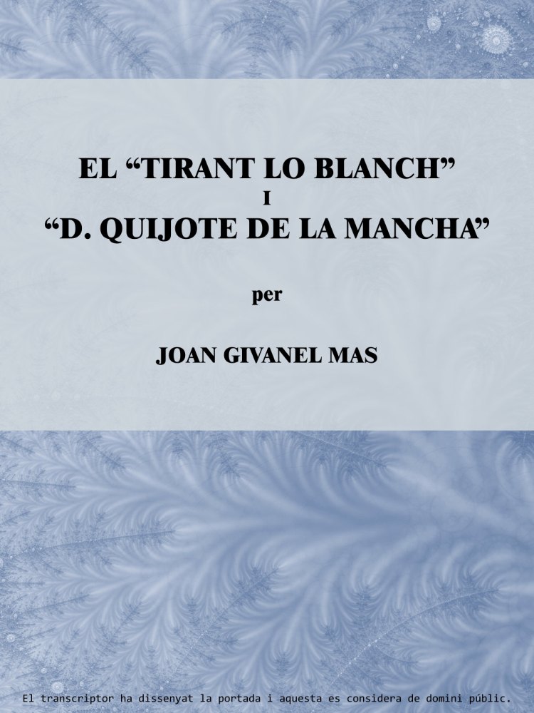 Tothom qui ha estudiat quelcom de literatura catalana sap que el llibre d’En Martorell i d’En Galba va publicar-se en 1490 a València, que es reproduí a Barcelona en 1497, que en 1511 s’imprimí en castellà a Valladolid, en 1538 en italià a Venècia, i en 1737 a Londres en francès,[14] però no es cosa tan sabuda ço que hem dit abans, i és que Cervantes havia llegit amb fruïció el famós Tirant, i això ens ho demostra en les poques ratlles que dedica al llibre on es descriuen les gestes del fill del Senyor de Marca de Tirania i de Blanca, la duquessa de Bretanya. Aquesta nova font del Don Quijote, ja la conegueren els il·lustres comentadors cervantins Bowle,[15] Clemencín[16] i Cortejón;[17] els altres, com Pellicer,[18] García de Arrieta,[19] Bastús,[20] Sales,[21] Máinez[22] i Rodríguez Marín,[23] en diuen poca cosa dels llibres de cavalleries, i per últim, Hartzenbusch[24] i Díaz de Benjumea[25] no en parlen.