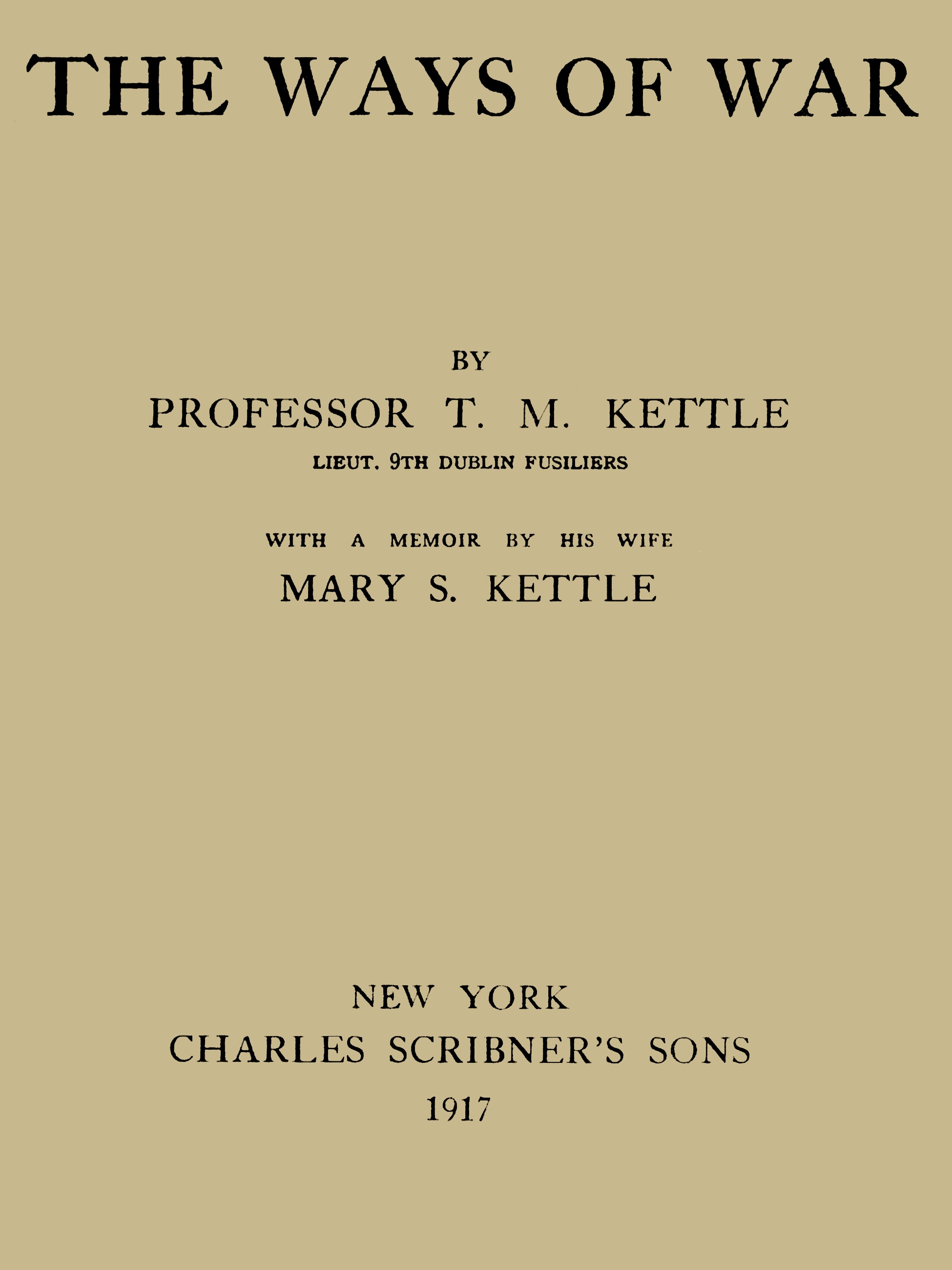 Perhaps the order of the chapters in the present book requires a word of explanation. They have a natural sequence as the confessions of an Irish man of letters as to why he felt called upon to offer up his life in the war for the freedom of the world. Kettle was one of the most brilliant figures both in the Young Ireland and Young Europe of his time. The opening chapters reveal him as a Nationalist concerned about the liberty not only of Ireland—though he never for a moment forgot that—but of every nation, small and great. He hoped to make these chapters part of a separate book, expounding the Irish attitude to the war; but unfortunately, as one must think, the War Office would not permit an Irish Officer to put his name to a work of the kind. After the chapters describing the inevitable sympathy of an Irishman with Serbia and Belgium—little nations attacked by two Imperial bullies—comes an account of the tragic scenes Kettle himself witnessed in Belgium, where he served as a war-correspondent in the early days of the war. “Silhouettes from the Front,” which follow, describe what he saw and felt later on, when, having taken a commission in the Dublin Fusiliers, he accompanied his regiment to France in time to take part in theviii Battle of the Somme. Then some chapters containing hints of that passion for France which was one of the great passions of his life. One of these, entitled “The New France,” was written before the war had made the world realise that France is still the triumphant flag-bearer of European civilisation. Then, in “The Gospel of the Devil,” we have an examination of the armed philosophies that have laid so much of France and the rest of Europe desolate. The book closes with “Trade or Honour?”—an appeal to the Allies to preserve high and disinterested motives in ending the war as in beginning it, and to turn a deaf ear to those political hucksters to whom gain means more than freedom. Thus “The Ways of War” is a book, not only of patriotism, but of international idealism. Above all, it is a passionate human document—the “apologia pro vita sua” of a soldier who died for freedom.