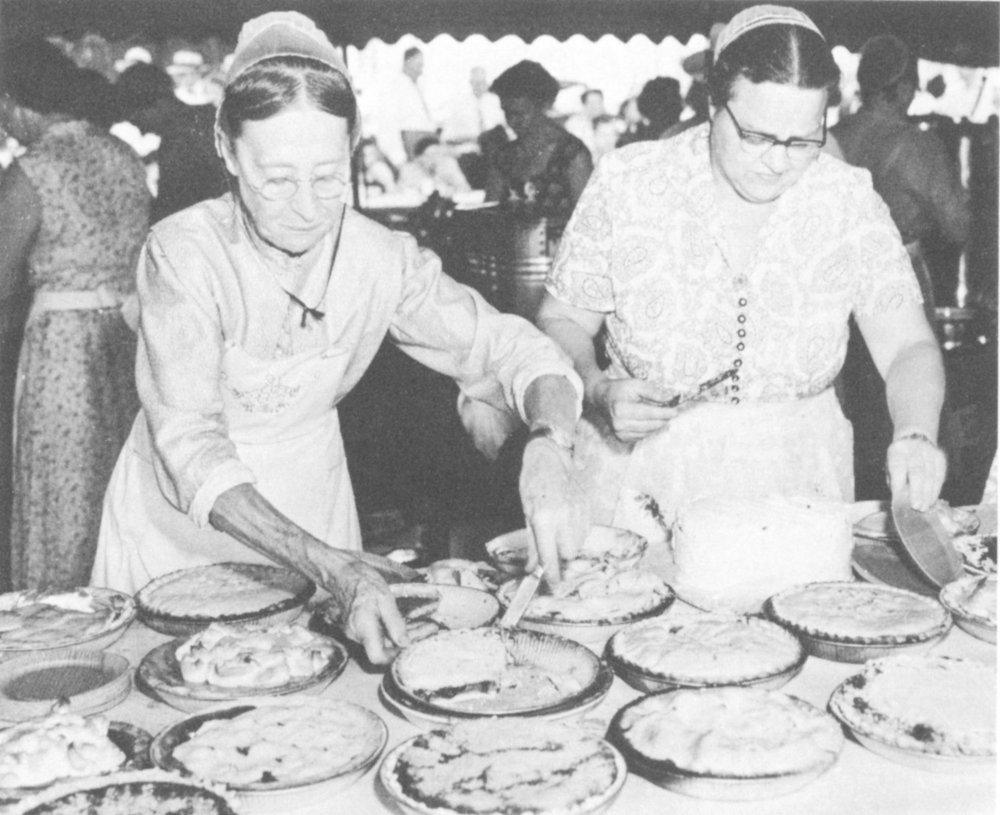 As early as 1709 a small group of Mennonites, followers of the martyr Menno Simons—“Switzers” as they were called—arrived in Penn’s Province, found their way to the Pequea creek and took up 10,000 acres of land. They were the direct descendants of the bitterly persecuted Anabaptists of the 16th century. They brought with them their lay ministers and their Bibles, and worshipped at first in their log houses. Later when these pioneer farmers began to erect meeting houses, they divided the building into two apartments by a swinging partition suspended from the ceiling. One apartment was used for religious, and the other for school purposes. Today, large Mennonite ‘meeting houses’ as their church buildings are called, are found everywhere in Lancaster County: at Willow Street, Mellingers, Strasburg, Manheim, Warwick and Brecknock as well as in a score of other congregational centers. Their ministers are now educated in the Mennonite colleges and seminaries. Two customs, however, have been strictly maintained: feet-washing in connection with the communion service, and the prayer head-covering among the women of the church.