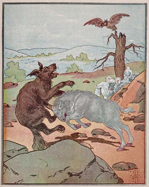 [10]“Don’t fear for me, sister mine. No old wolf will get the better of me while I have two such long, sharp horns on my head as I now have. Why, a wolf is nothing more than a wild dog, and you know how I treat ugly, cross dogs.”